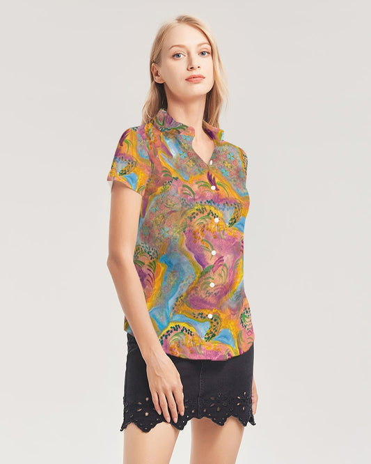 Around the world Women's All-Over Print Short Sleeve Button Up