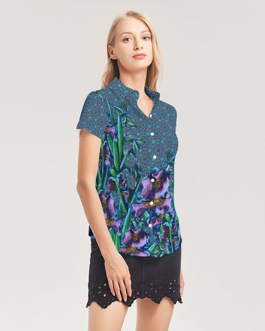 Iris Garden Women's All-Over Print Short Sleeve Button Up