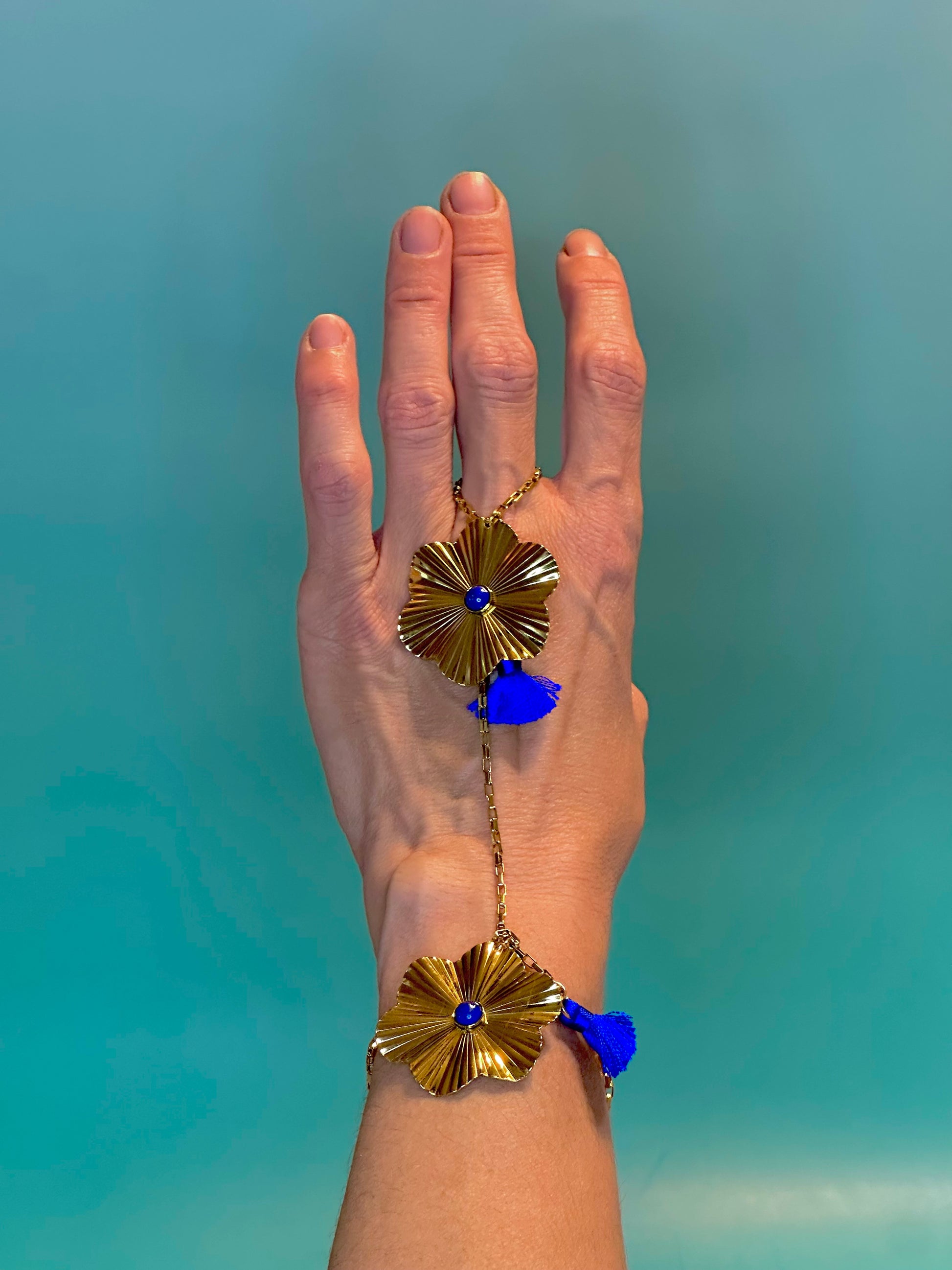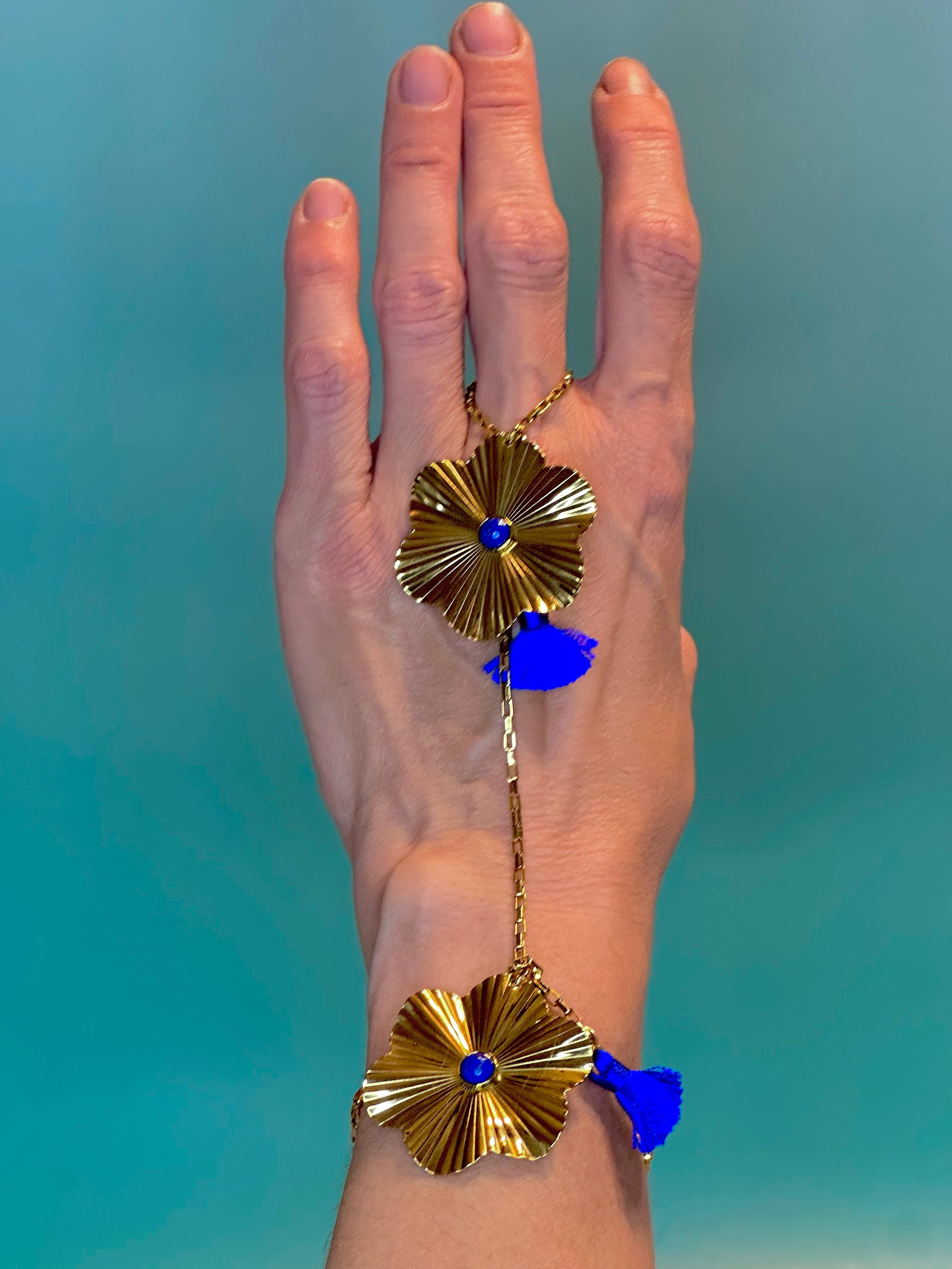 A gold disk with lapis center and tassel hang suspended from a hand chain with matching charms wrapping around the wrist. Perfect for a music festival or cocktail party.