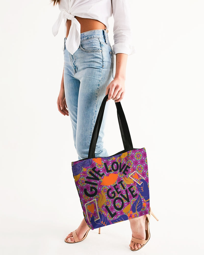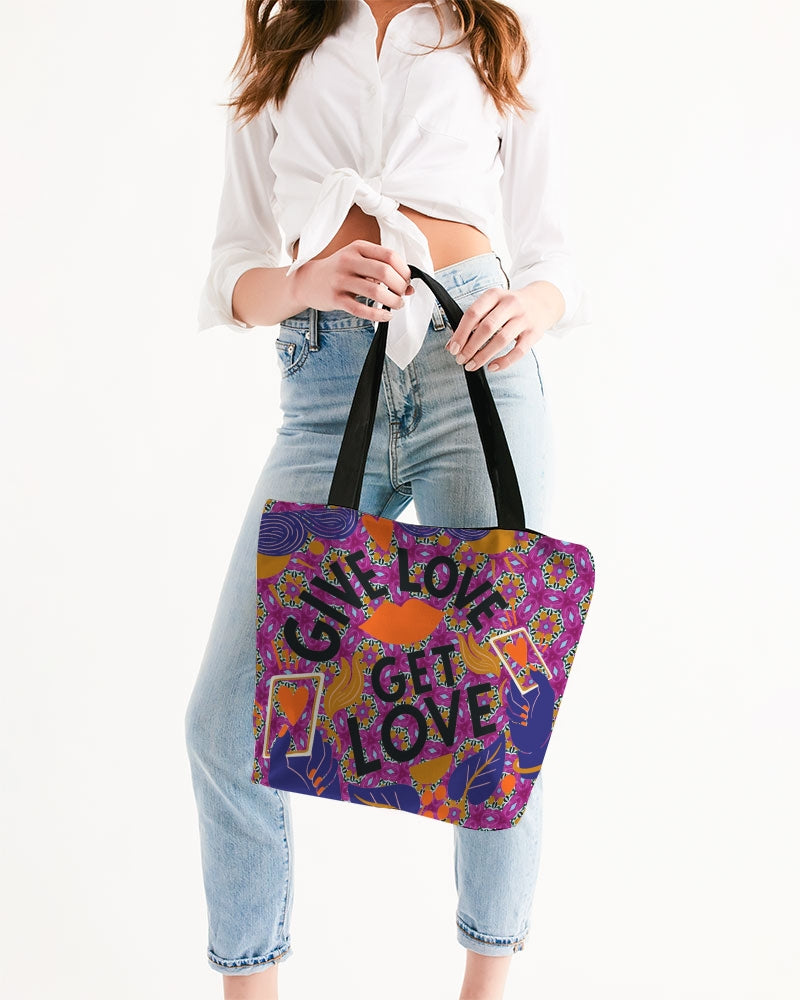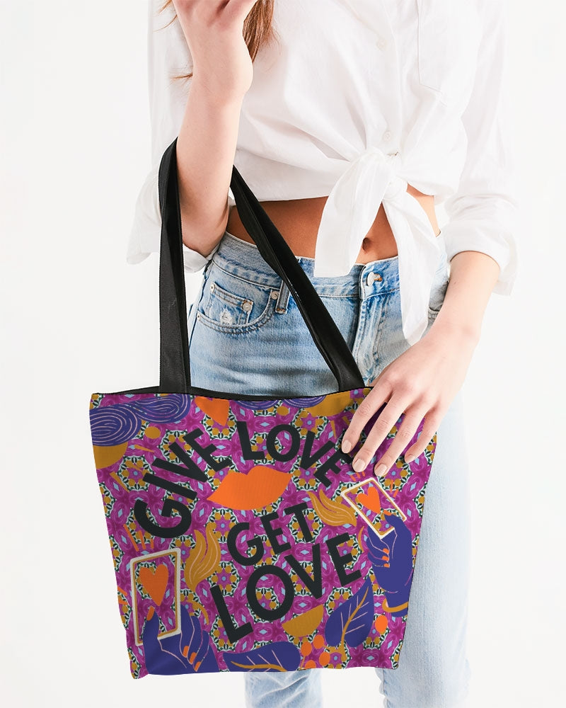 About The ArtGive Love Give love, get love sings across a fuchsia pink, geometric design.Original design Areej Zufari2023 Product DetailsPerfect for beach escapes or picnic lunches, our durable Canvas Zip Tote radiates your unique style and holds everything you need. Exterior and interior zip pockets ensure small items don't get lost.