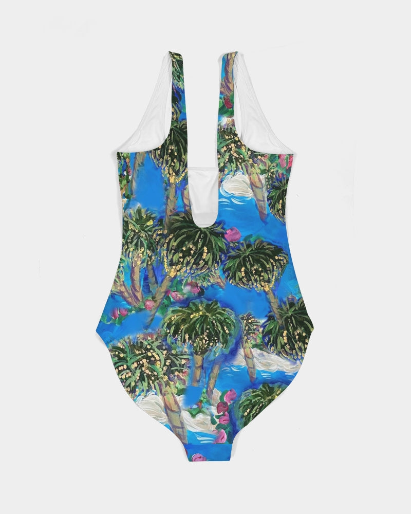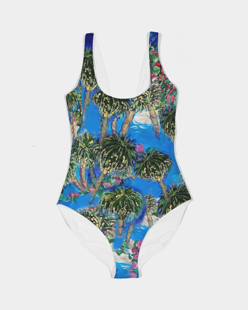 About The ArtMambo Craze Palm Trees and Caribbean islands fill this painting with palm trees swaying against a lapis-blue sky.Original art by Areej ZufariAcrylic paint on canvas2023 Product DetailsWith its simple scoop neck and modest cuts, our Women's One-Piece Swimsuit compliments all body types. Stretchy, padded, and built-in UPF 50+, this swimsuit offers excellent comfort, support, and UV protection.