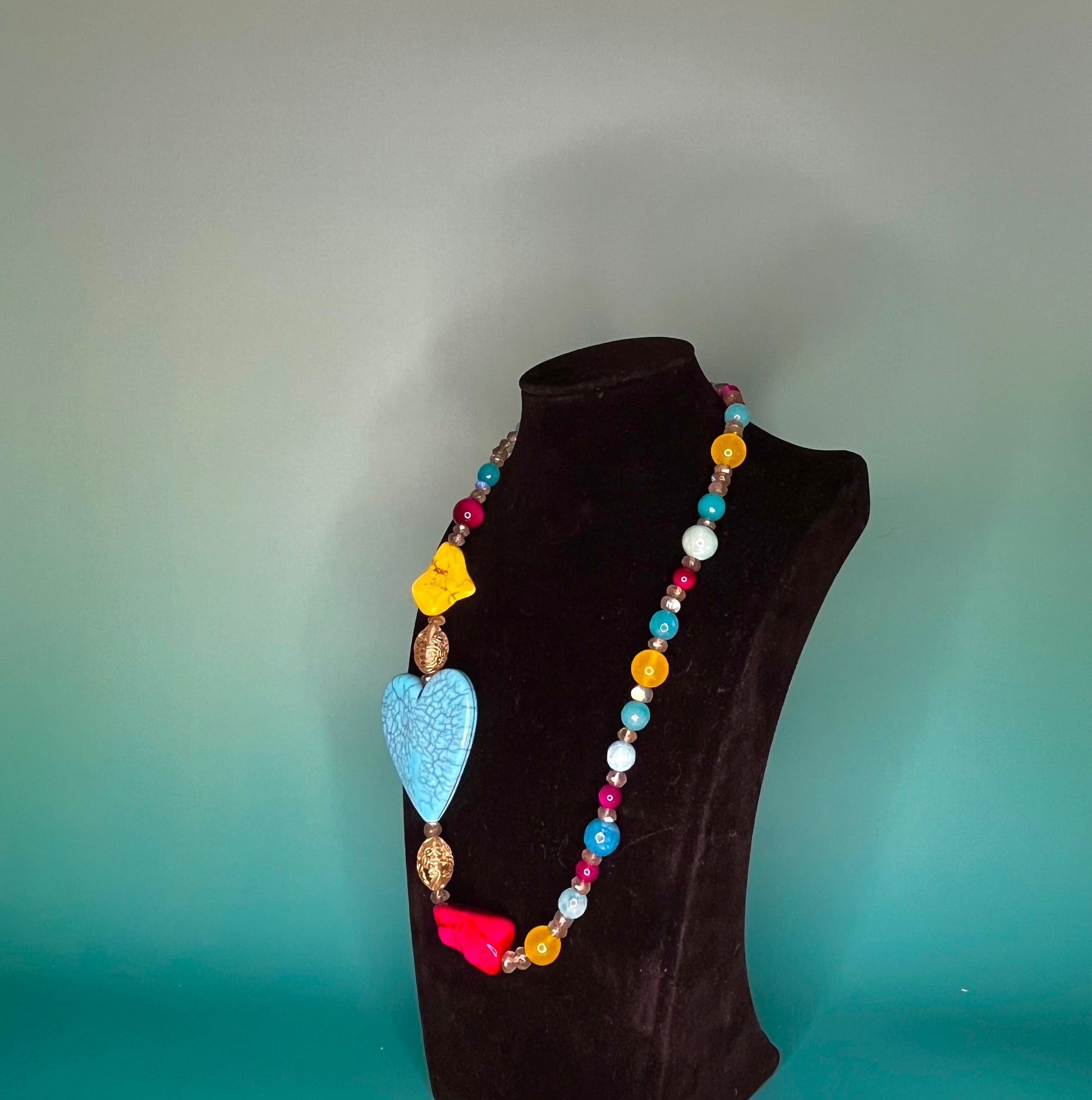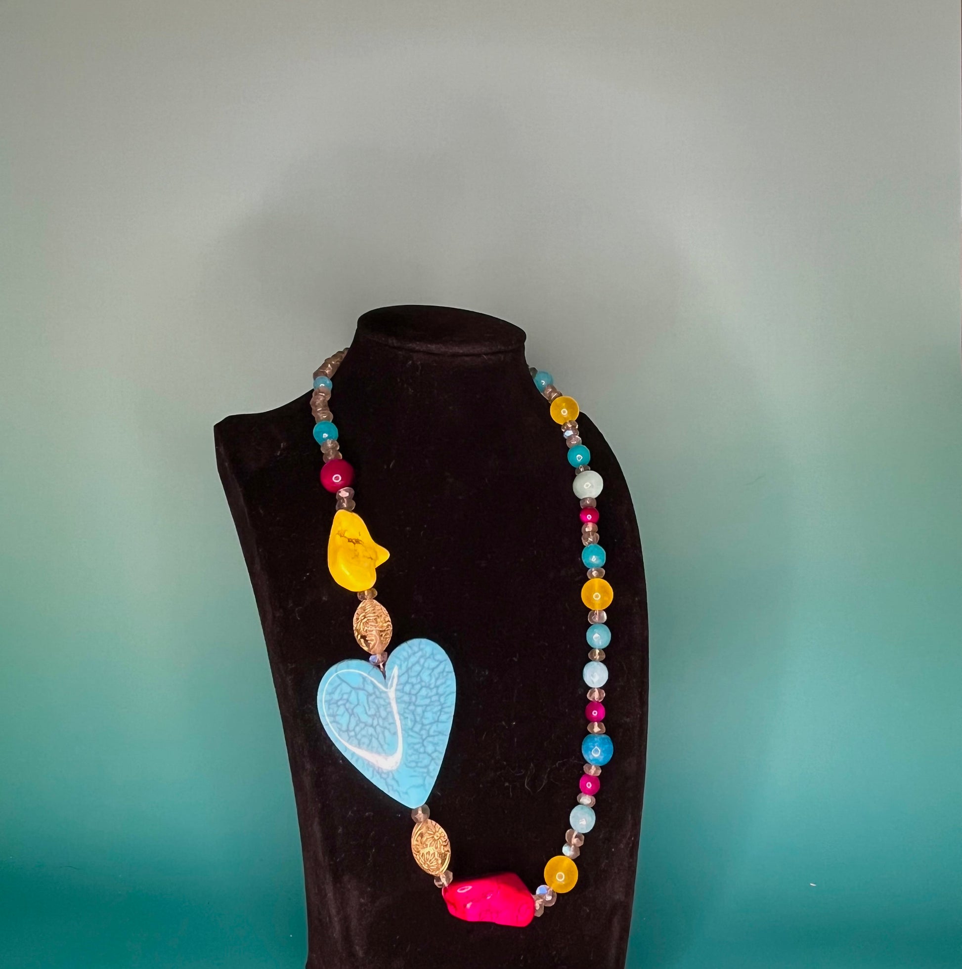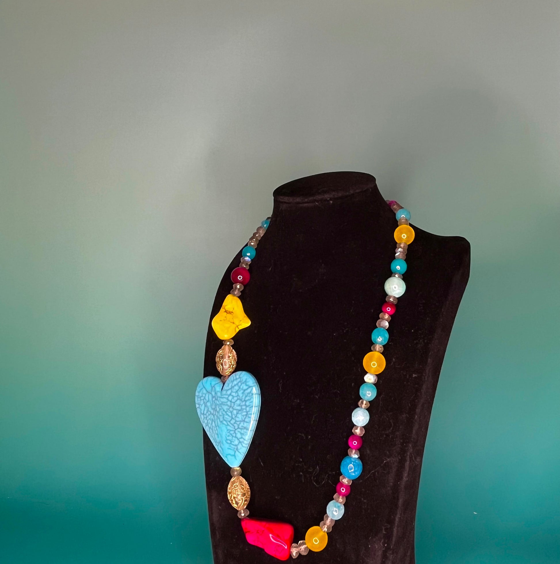 Playful, summertime colors of turquoise, yellow, and fuchsia make a statement with this fun and funky Necklace. Its asymmetrical design and big turquoise heart add a bright and playful touch to any outfit.